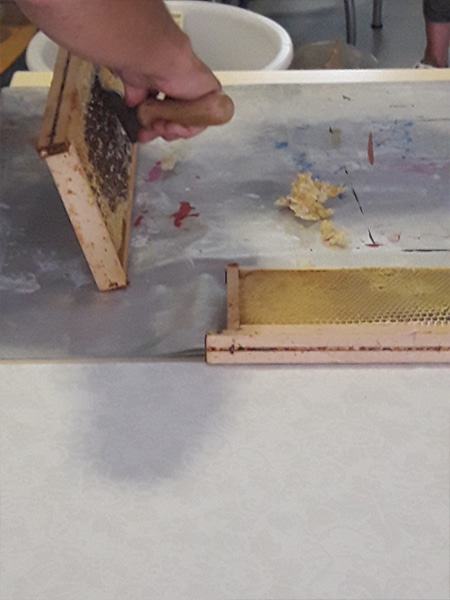 L’apicultrice a ôté, à l’aide d’un couteau, la couche d’opercules qui ferme chaque alvéole pour en extraire le miel. Elle a ensuite déposé le cadre dans un extracteur manuel. Après la mise en place des cadres, nous avons tourné la manivelle de l’extracteur. Les gouttes de miel ont été projetées sur les parois. Chaque face du cadre a été vidée de son miel qui coule dans la machine. On le récolte grâce à un petit robinet.