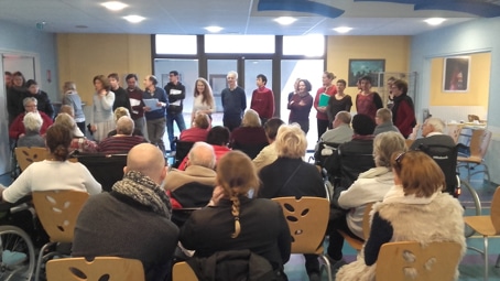 Les chants du monde polyphoniques ont été interprétés par une chorale composée d’une quinzaine de chanteuses et de chanteurs, dirigés par Marie‐Philippe Lécuyer (chef de chœur) devant une trentaine de personnes : patients et familles.